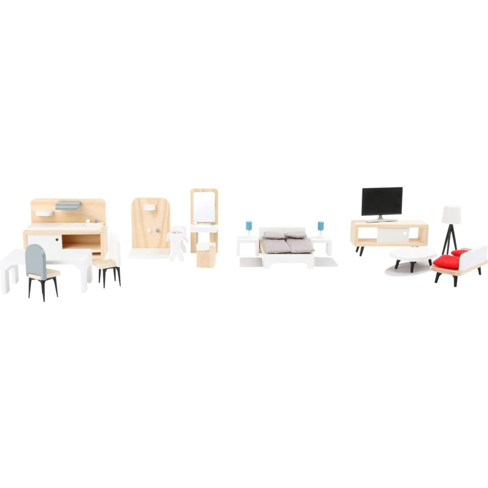 Small Foot 11414 Complete Doll's House Furniture Set made of Wood, Living Room, Kitchen, Bedroom and Bathroom, for Ages 3 Years and up