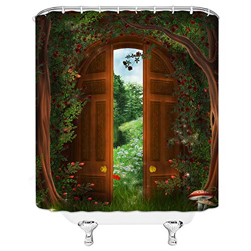 jingjiji Green Forest Shower Curtain Fantasy Garden Wooden Door Garden Tree House Fairy Tale World Natural Scenery Bathroom Decoration Curtains Polyester Fabric with Hook 70 X 70 Inch Green Brown