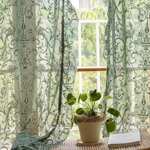 TUDECO Green Sheer Curtains 84 Inch Long - Rustic Country Lace Curtains for Living Room Tulle Floral Ruffle Privacy Spring Decor Light Filtering Window Curtains, 59 x 84 Inch, Forest Green