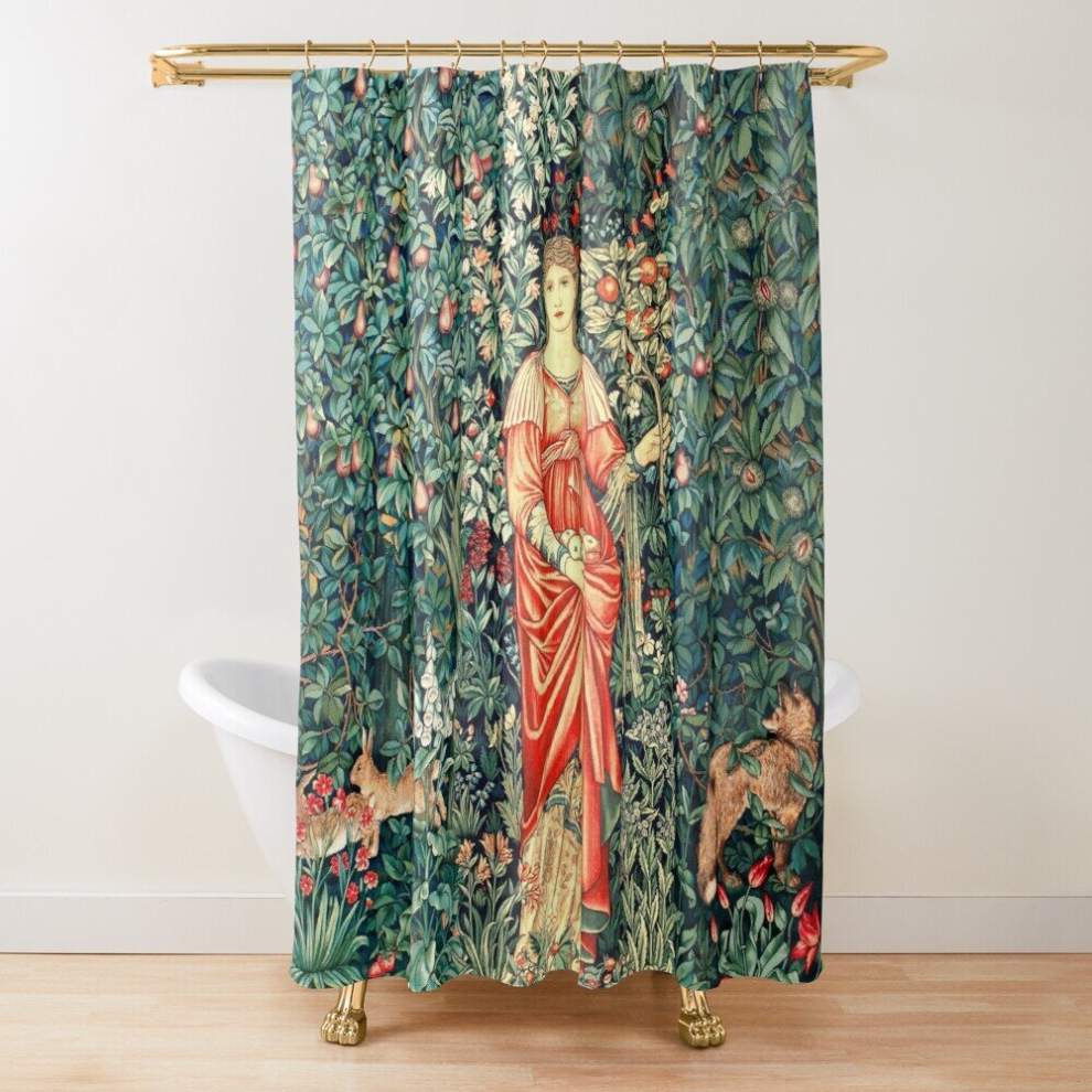 Shower Curtains POMONA GODDESS OF ABUNDANCE HOLDING FRUITS IN GREENERY, FOREST ANIMALS Fox,Hares Red Blue Green Floral for Bathroom Decor 72x72 inches