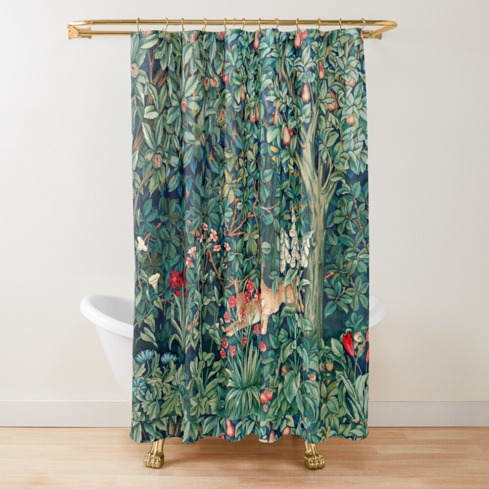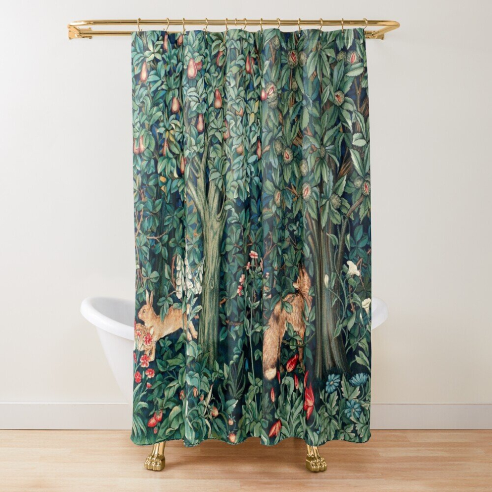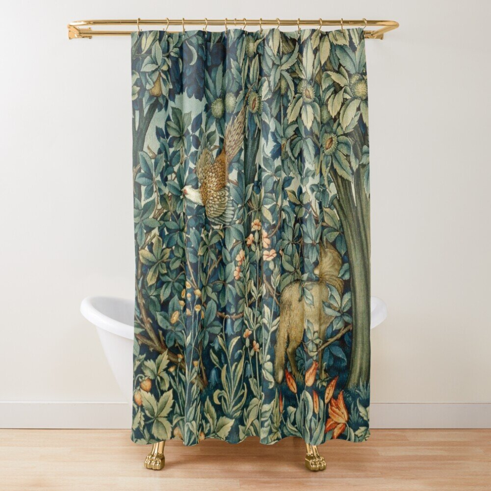 Shower Curtains GREENERY, FOREST ANIMALS Fox and Hares Blue Green Floral for Bathroom Decor 72x72 inches