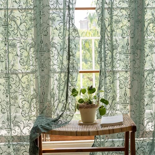 TUDECO Dark Green Curtains 96 Inch Long - Antique Embroidered Lace Sheer Curtains for Living Room Farmhouse Summer Floral Forest Ruffle Curtains Rod Pocket 2 Panels, 8 FT 59W x 96L, Olive Green
