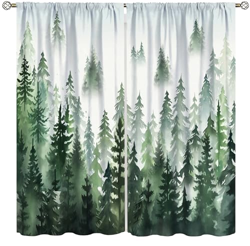 SXXLDNG Green Forest Curtains Green Watercolor Forest Tree Silhouette Nature Landscape Printed Living Room Bedroom Window Drapes 42x63inch(107x160cm)