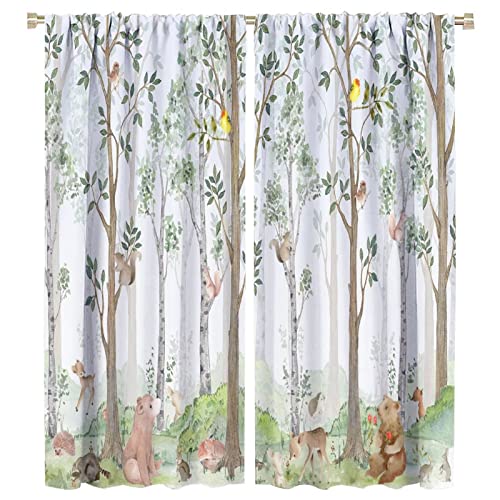 SHElifestyle Kids Watercolor Woodland Animal Window Curtains, Bear Deer Squirrel Hedgehog Fox Birds Green Forest Blackout Rod Pocket Treatment for Boys Girls Bedroom 42x45in