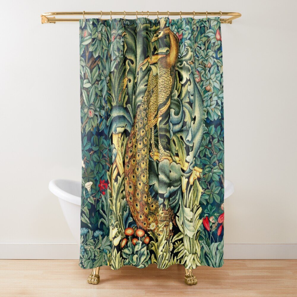 Shower Curtains GREENERY, FOREST ANIMALS ,PEACOCK WITH ACANTHUS LEAVES Blue Green Floral for Bathroom Decor 72x72 inches