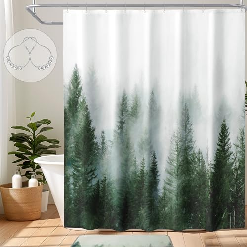 Accnicc Green Misty Forest Shower Curtain Ombre Sage Green White Mountain Pine Tree Waterproof Fabric Shower Curtains for Bathroom Nature Woodland Decorative Modern Bath Curtain Decor 72×72 Inches
