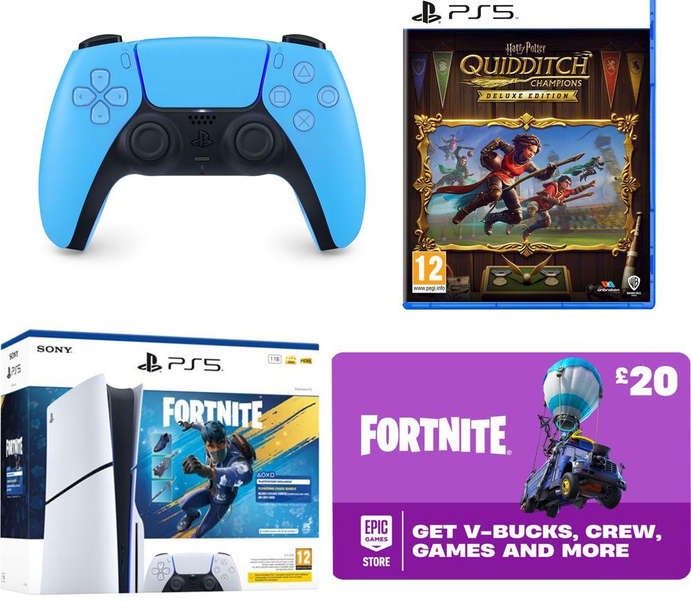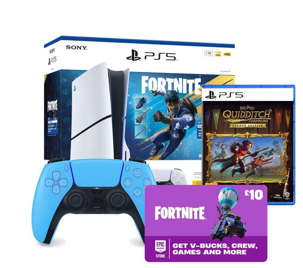 Sony PlayStation 5 Console, Fortnite Flowering Chaos, Fortnite Gift Card (£20), PS5 DualSense Wireless Controller & Harry Potter (Quidditch Champions Deluxe Edition) Bundle