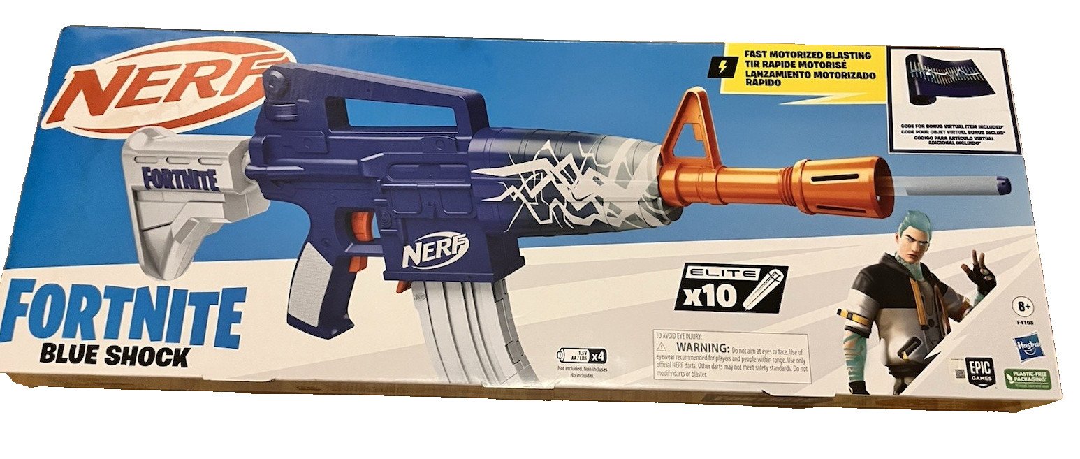 Nerf Fortnite Blue Shock Blaster, 10-Dart Clip, 10 Elite Nerf Darts, Includes Bonus Code to Unlock The Beat Wrap in The Game, Motorized Dart Blaster