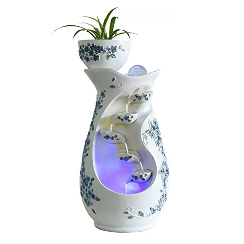 desktop fountain Indoor Desktop Tabletop Water Fountain White Background Blue Flower Layered Resin Vase Jugs Elegant Interior Water Feature Decorative Fountain for Home and Office table fountain(G