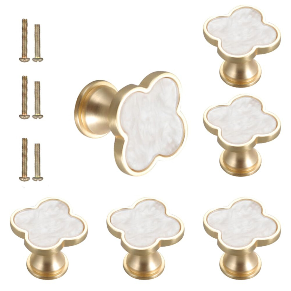 CPELLESSE 6 Pack Clover Knobs Four-Leaf Clover Handle Creative Cabinet Drawer Pulls Gold Knobs for Dresser Wardrobe Pulls Zinc Alloy Single Hole Door Handle(White)