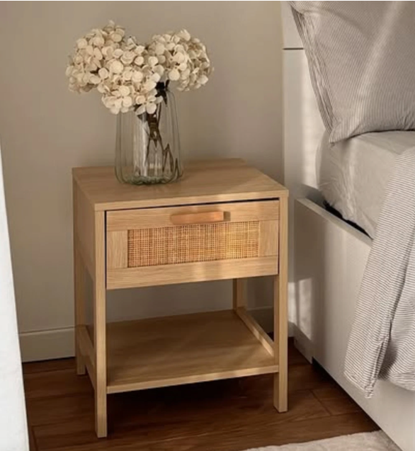 Bedroom Bedside Table Nightstand Storage Organiser Drawer Rattan Shelf Oak Style