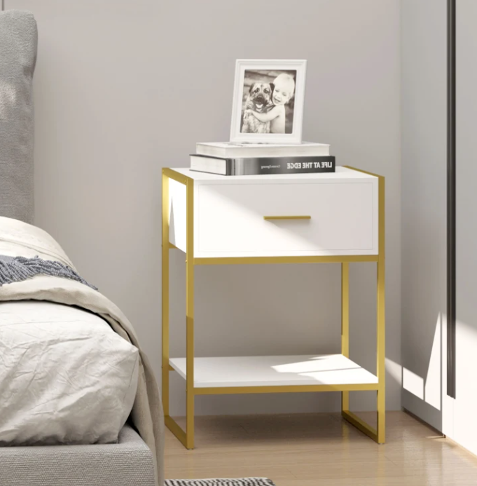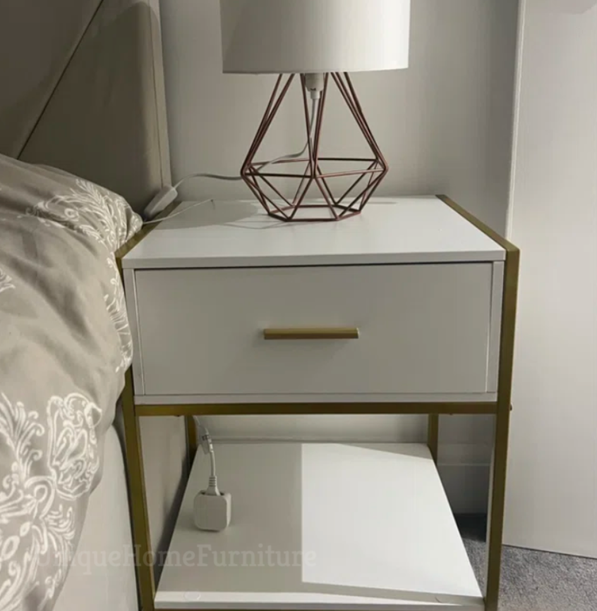 White Bedside Table Contemporary Gold Drawer Cabinet Modern Shelf Lamp Stand
