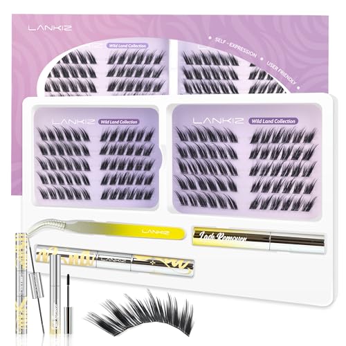 Cluster Lashes Kit - C Curl Individual Eyelashes Kit with Lash Bond Seal Remover Tweezers - LANKIZ Wispy Fluffy Fox Eye Eyelash Clusters for Striking Evening Looks