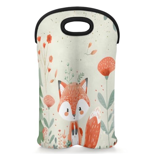 Mintoprints Fox Wine Carrier Tote Bag for 2 Bottles Farm Animals Cute Wildlife Neoprene Wine Bottle Holder Carriers Bag Case Wine Cooler Bag for Travel, Picnic, Party