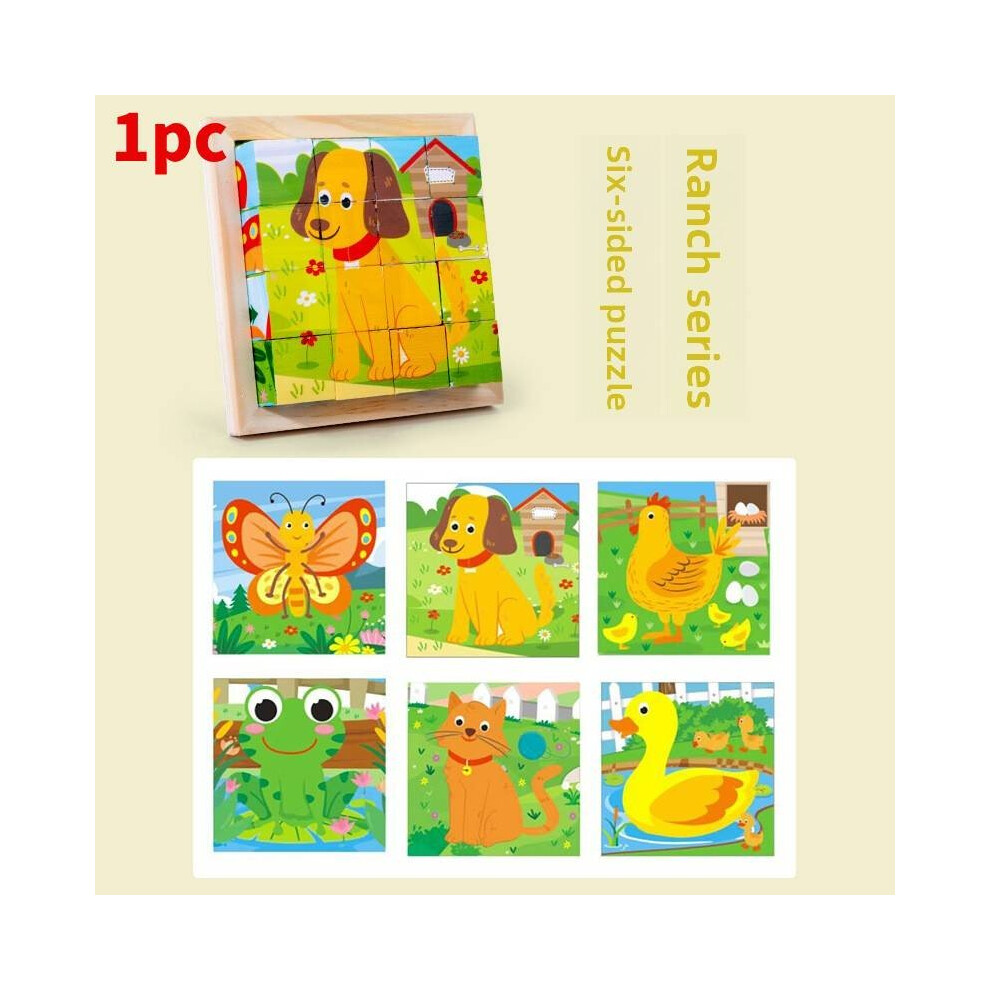 (Farm ) Wooden Six Kids Sided Volume Wood 3d Puzzle With Tiger Fox Dog Print Dinosaurs