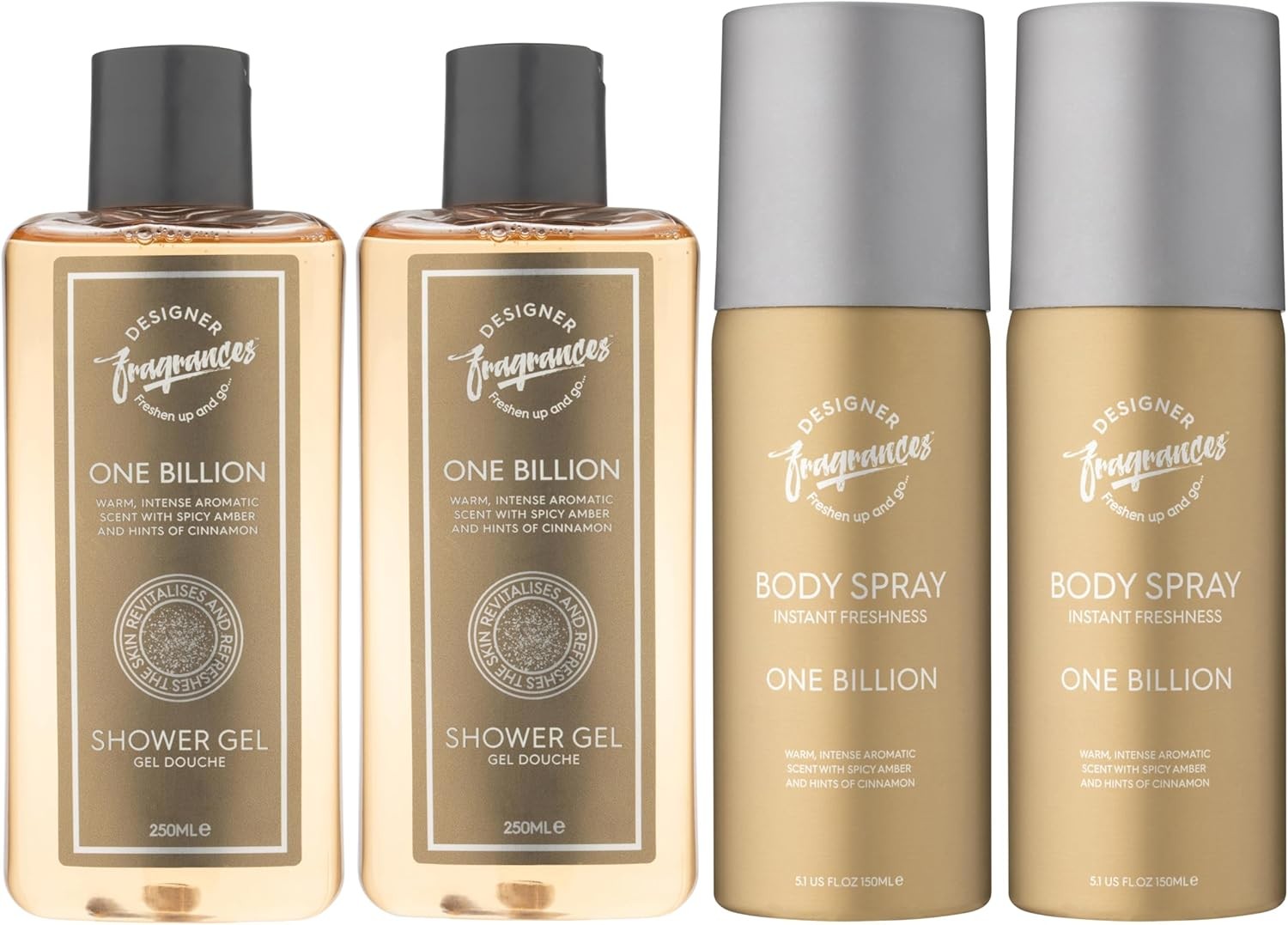 Designer Fragrances One Billion Men's Body Spray & Shower Gel 4-Pack Bundle