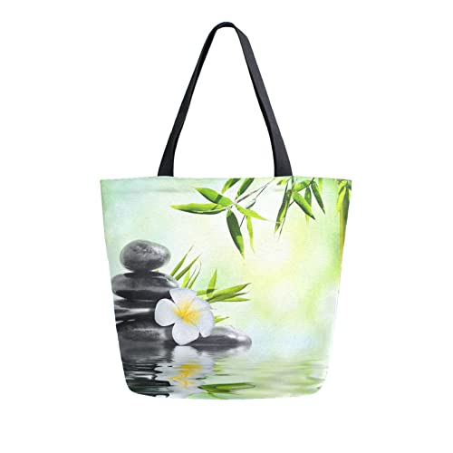 zerosevenee Spa Massage Black Zen Stone Frangipani Flower Green Bamboo Pool Canvas Tote Grocery Bag, Women Large Casual Shoulder Bag, Reusable with Pocket Grocery Handbag for Shopping Travel Outdoors