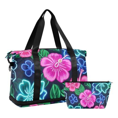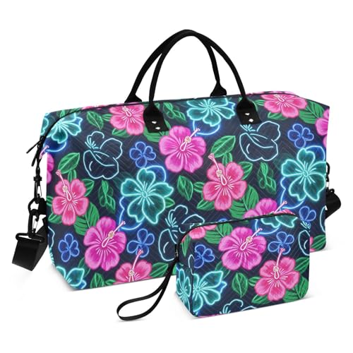 Summer Neon Hibiscus Frangipani Flower Overnight Travel Duffel Bag Weekender Travel Overnight Bag Gym Bag with Adjustable Strap for Sports 2 Pcs Set Bolsa para viajar en Avion de Mujer