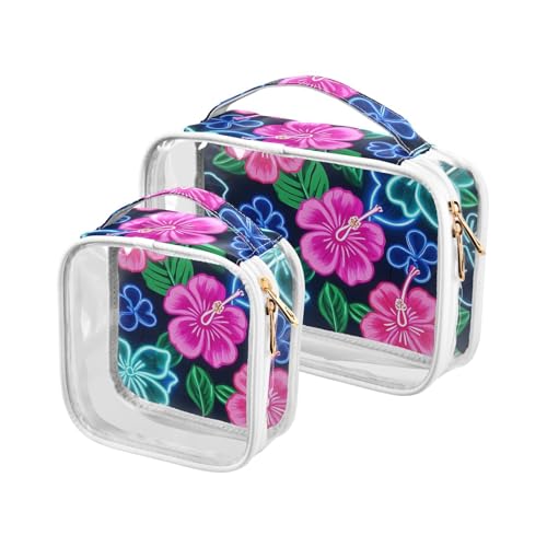 2 Pack clear Summer Neon Hibiscus Frangipani Flower toiletry bag large TSA approved multifunctional makeup bag small Airport Airline Compliant, Summer neon Hibiscus frangipani flower