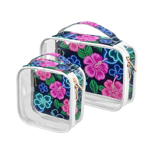 Amooorous 2 Pack Summer Neon Hibiscus Frangipani Flower clear decorative toiletry bag small TSA approved reusable cosmetic bag travel travel essential de maquillaje para, Summer neon Hibiscus