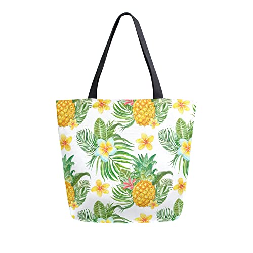 DJNGN Canvas Tote Bag Tropical Ripe Fresh Pine Woman Beach Bag Summer Frangipani Flowers Shoulder Bag Large Reusable Handbag Lightweight for Shopping Grocery Travel