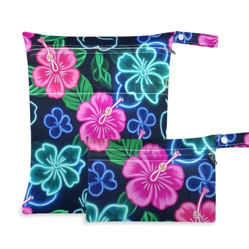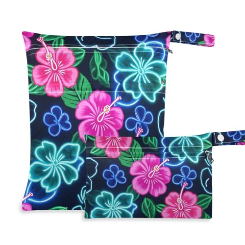EtherSpher Summer Neon Hibiscus Frangipani Flower reusable wet dry bag 2 Pack travel essentials for babies with handles for baby diapers, beach