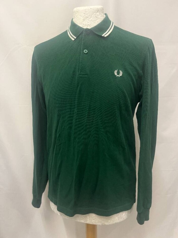 Fred Perry Mens Uniform Green Long Sleeve Plain Polo Shirt Cotton - Size Small