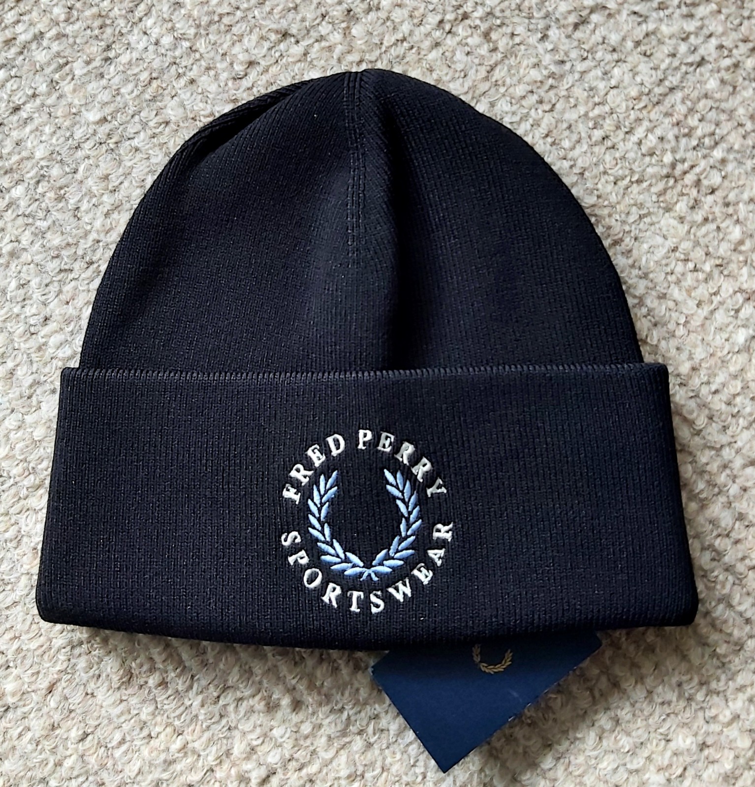 Genuine FRED PERRY Black Deeper Cuff White Logo BEANIE HAT UNISEX Tags