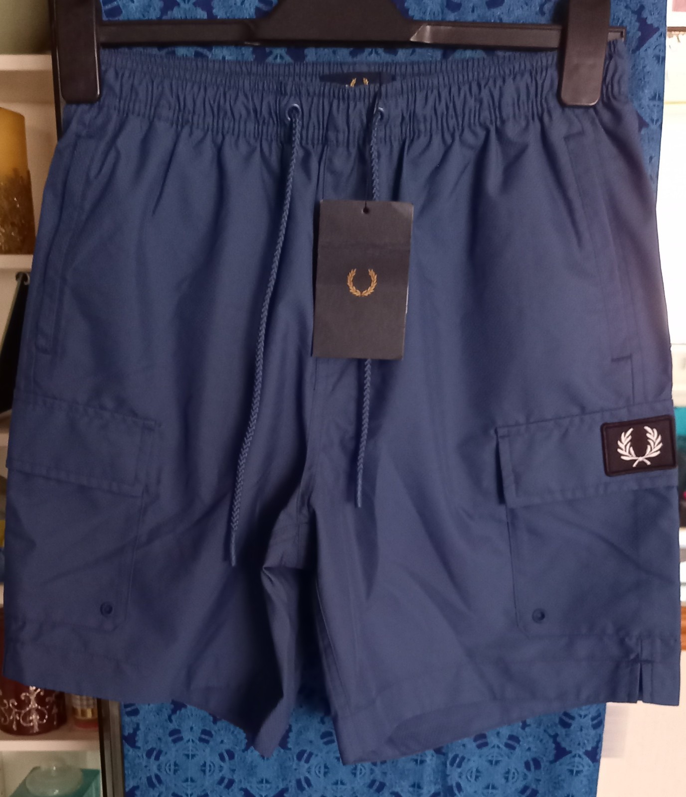 Fred Perry Badge Logo Cargo Swim Shorts in Midnight Blue, Men's Size Small