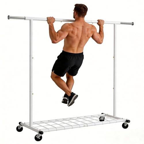 MISSLO Heavy Duty Clothes Rail on Wheels for Bedroom, Metal Clothes Rack Strong Clothing Garment Rack with Storage Bottom Shelf, Free standing Hanging