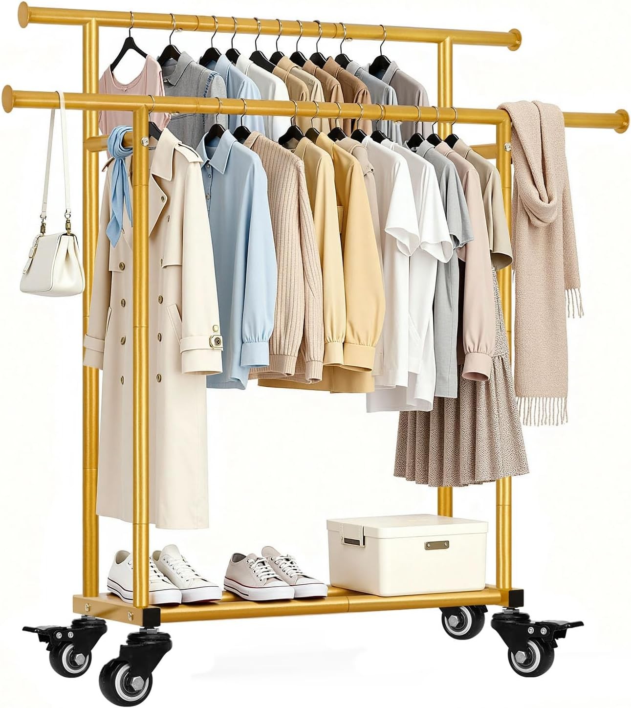 (Double Rail) Clothes Hanging Rail Metal Clothing Rail, Free Standing Clothes Racks with Hooks Bottom Rack