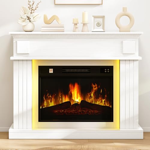TAUS Fireplace with 39" Surround, White Electric Fireplace Free Standing with Realistic Flame Effect Fireplaces Heater, with Timer and 7 Color LED Light Strip and Remote Control