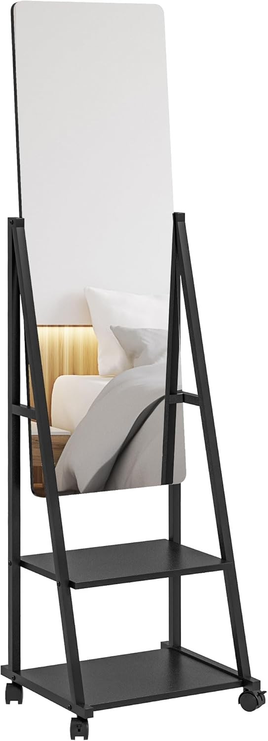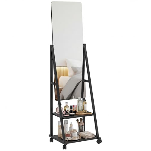 HOMCOM Free Standing Full Length Mirror, Rolling Full Body Mirror with Adjustable Angle, 2 Storage Shelves and 4 Wheels for Bedroom, Living Room, Hallway, Black