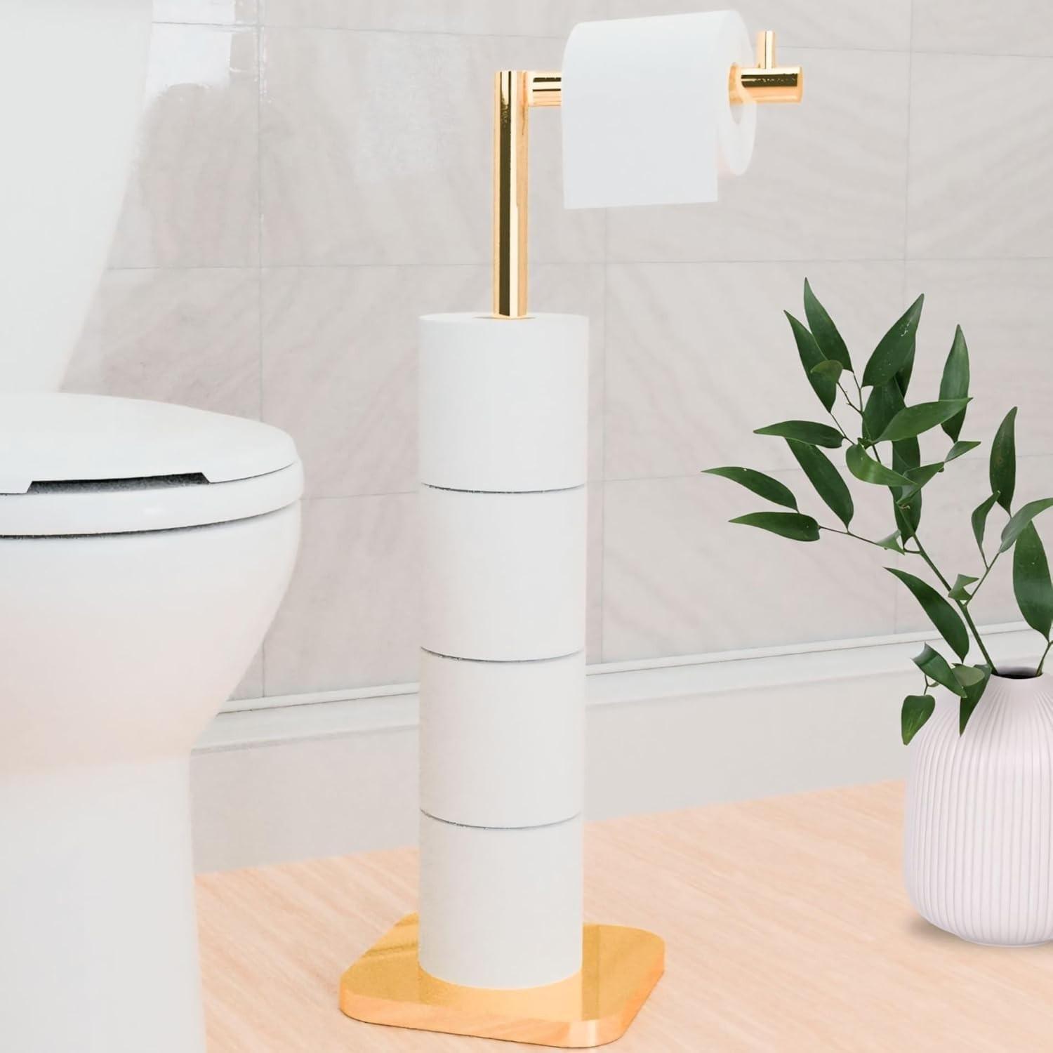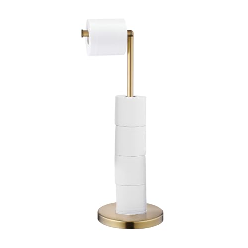 Toilet Paper Holder, Free Standing Toilet Paper Holder Stand with Reserve for 4 Spare Rolls, Sturdy Base, Toilet Tissue Paper Roll Storage Shelf (Stainless Steel Base, Gold)