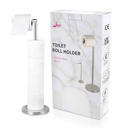 Akos Stainless Steel Silver Toilet Roll Holder - Free Standing Toilet Paper Holder with Storage - Floor Standing Toilet Roll Holder Stand that Holds 5 Paper Rolls
