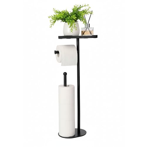 Black Toilet Paper Holder Stand Free Standing Toilet Paper Storage Holder with Shelf Bathroom Floor Toilet Paper Roll Holder Stand Up Tissue Toilet Paper Dispenser Holds 4 Reserve Rolls