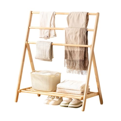 Labasuan Folding Towel Rack, 3 Tier Free Standing Wood Garment Rack with Shelves, Portable Bath Towel Holder Clothes Organizer Drying Rack, for Entryway & Bed Room(Natural,82cm/32.3in)