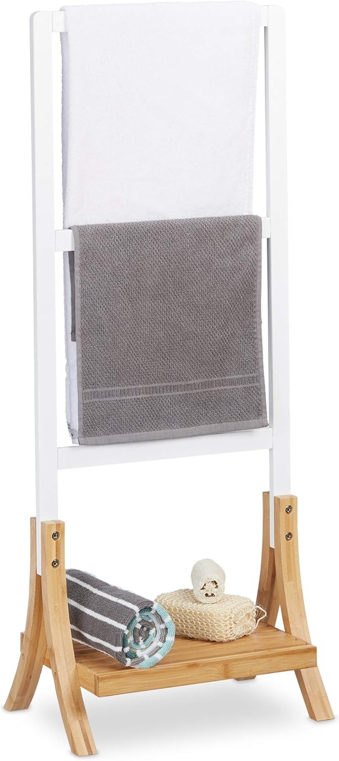 Relaxdays Free-Standing Bamboo Towel Holder, HWD: 104 x 41 x 28.5 cm, 3 Rails and 1 Shelf, Clothes Stand, Natural/White