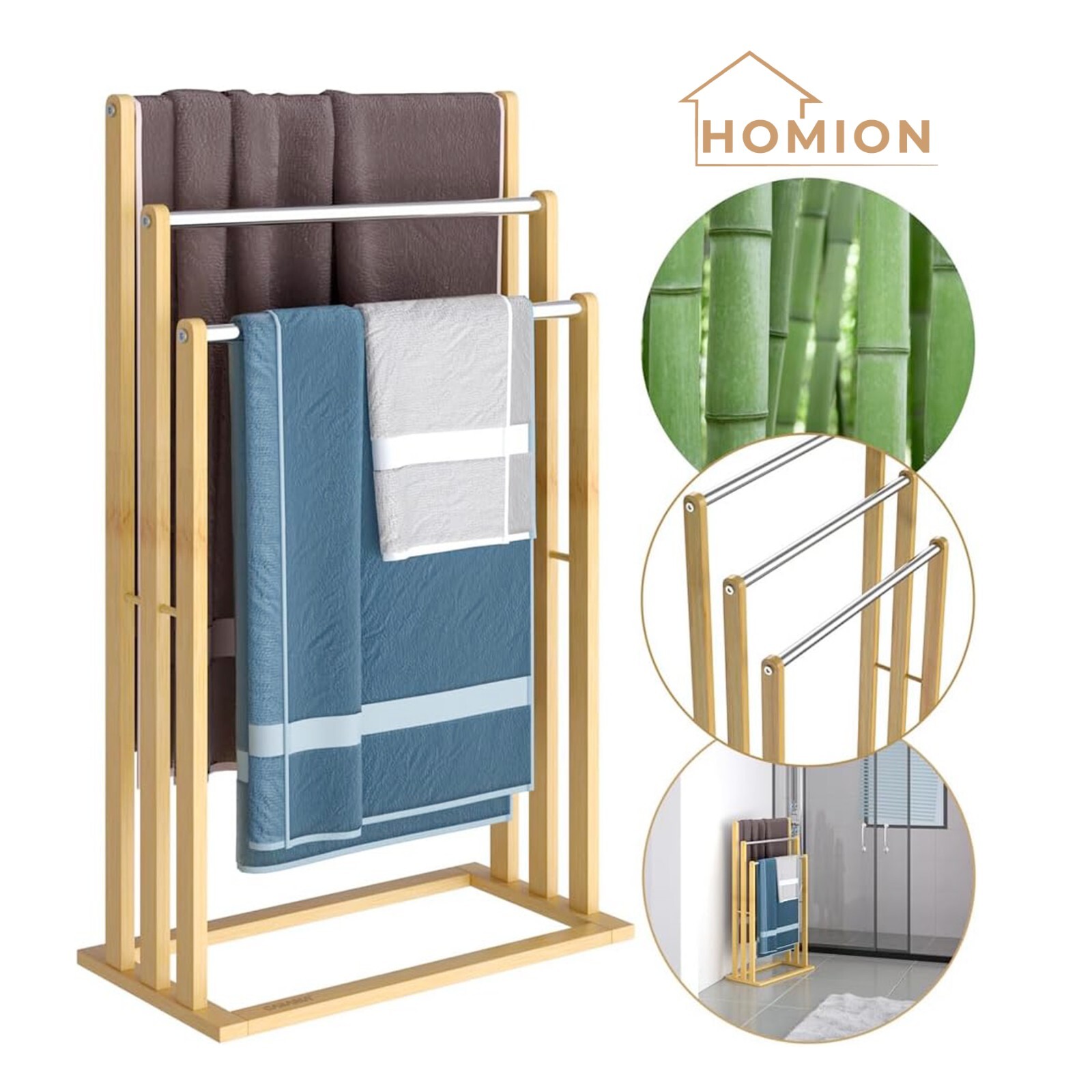 Bamboo Free Standing Towel Rail Rack Bathroom Drying Stand & Storage Organizer