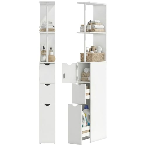 SoBuy Tall Bathroom Cabinet 20cm Wide - Freestanding Slim Bathroom Storage Unit - Water-Resistant MDF with Adjustable Shelves and Drawer,Compact Storage Cupboard, White, W20 x D20 x H180cm BZR34-II-W