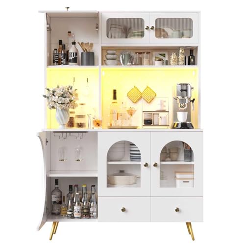 120x40x176 cm Highboard Kitchen Cupboard With LED Lighting USB Ports Power Outlets Drawers Perforated Wall Glass Shelves Freestanding Kitchen Unit For Kitchen Dining Room,white