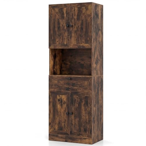 TANGZON Tall Kitchen Cupboard, 4-Door Pantry Cabinet with Adjustable Shelf, Drawer, Countertop & Anti-tipping Kits, Freestanding Sideboard Kitchen Storage Unit for Dining Living Room (Rustic Brown)