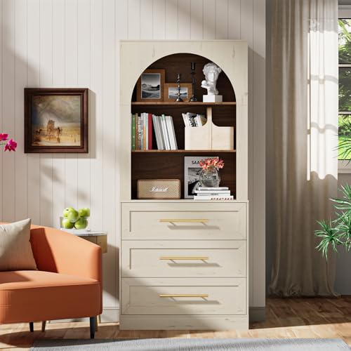 UEV Modern Kitchen and Dining Sideboard Set, 3-Drawer Cabinet with Top Arch, Freestanding Cupboard for Pantry, Utensils & Decorative Display, Beige