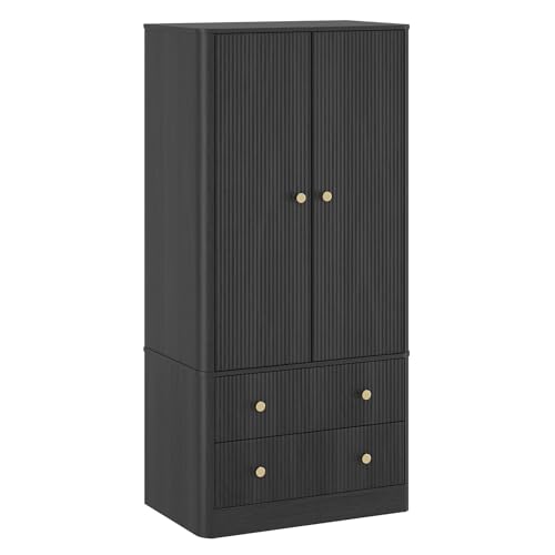 TARSHYRY Armoire Wardrobe Closet with 2 Doors and 2 Drawers, Farmhouse Freestanding Coat Closet Wardrobe Cabinet with Hanging Rail, Freestanding Combination for Hanging Clothes (Black)