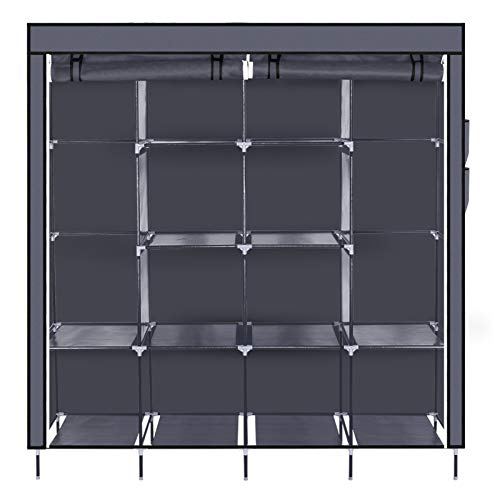 Deuxff Portable Closet Organizers,Freestanding Closet Wardrobe with 12 Shelves 4 Side Pockets for Hanging Clothes,Metal Clothing Rack with Non-Woven Fabric Cover for Bedroom (Gray)
