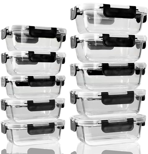 TempFoo Glass Food Storage Containers with Lids set 10, Meal Prep Reusable Airtight Lunch Box, kitchen Cooking Pantry Organizers, Suitable for Microwave Freezer - black