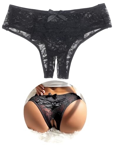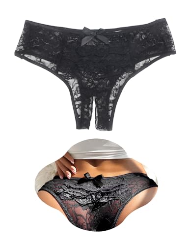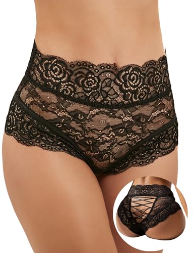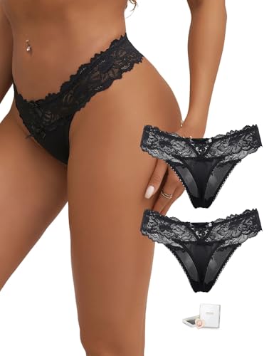 ohyeahlady Thongs for Women Sexy Panties Sheer Lace Underwear Soft Stretchy French Knickers Low Rise Brazilian Knickers Underpants Lace Up Bikini Briefs 1 Pack Black Size 8 10