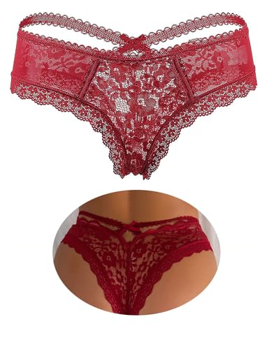 comeondear French Knickers for Women Cross Bands V-Shaped Design on the Back Lace Thongs Knickers Low Tangas Cheeky Panties Soft Stretchy Plus Size Low Waist Briefs Red 8 10