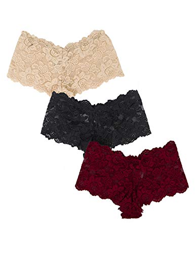 ohyeahlady Women Sheer Lace French Knickers Plus Size Underwear Hipster Panties Boyshorts Briefs, 3 Pack(Black/Red/Nude)