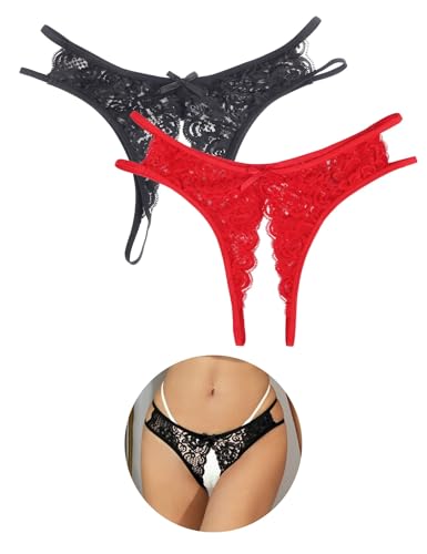 ohmydear Floral Lace Thongs for Women Sexy French Knickers Plus Size Underwear Sets Bikini Briefs Soft Cotton Crotch Hipster Panties Black Pack of 2 Thong Multipack